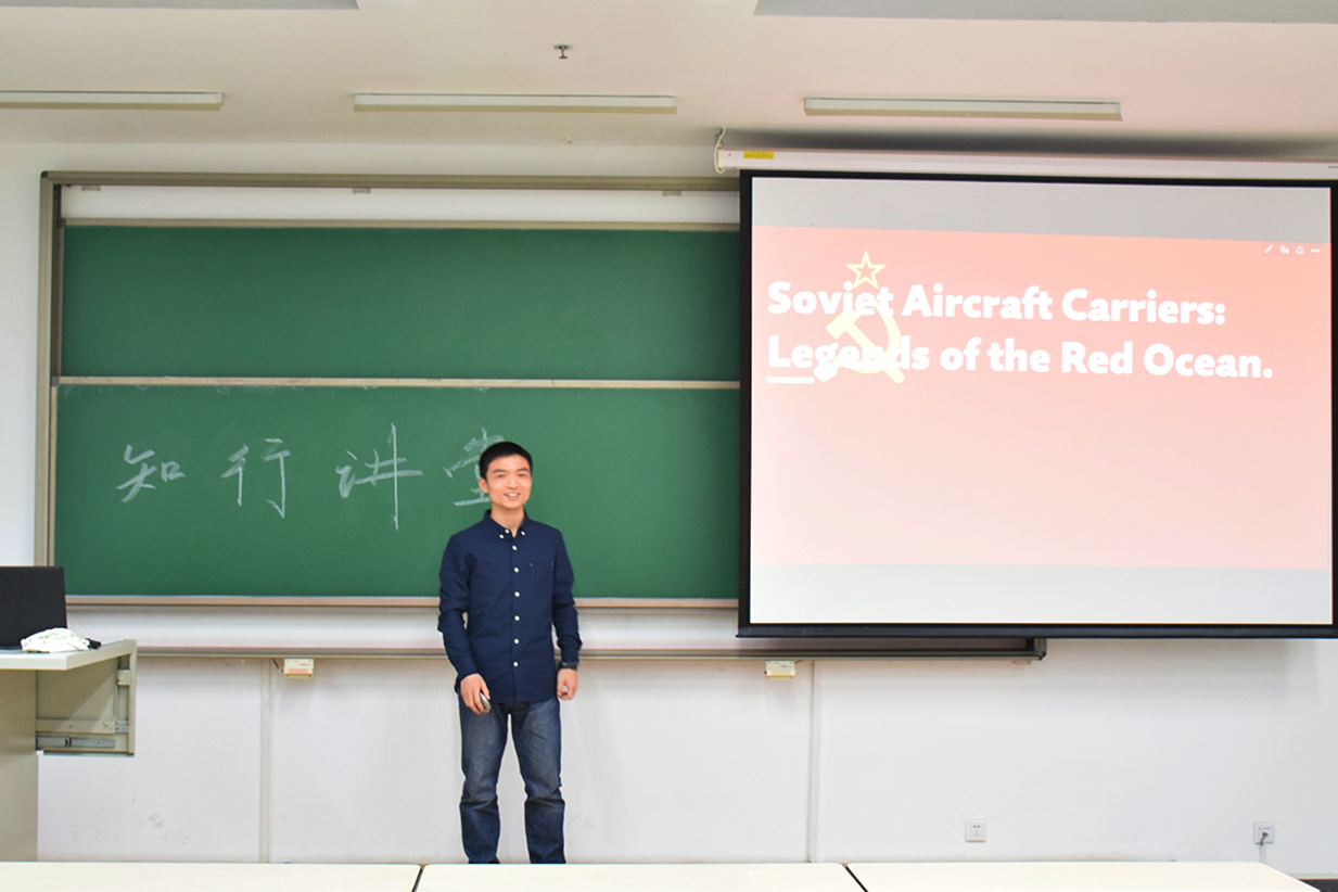接下来王昱森同学为我们介绍了苏联航母的发展历史。王昱森同学将苏联航母的发展历史分为了四个阶段,每个阶段都充满了坎坷的故事。在发展初期,由于苏联战略中心的偏移及领导人意志的影响,航母一直得不到很大重视,甚至被赫鲁晓夫斥之为“浮动棺材”。到了20世界60年代,苏联由于美国战略核潜艇的威慑,航母意识觉醒,开始发展航母,但是却又因为领导人意志的不连续而使得发展进度几经波折。王昱森同学充满遗憾地给我们介绍了苏联的几艘航母的波折甚至悲剧的历程,如基辅级的航母或被卖至异国他乡或是难逃被拆的悲惨命运,明斯克号在中国成了展览品,代表着苏联海洋强军梦想的乌里扬诺夫号甚至没能完成建造就因苏联的解体而胎死腹中。中国的辽宁舰——当年的瓦良格号也是历经舛途才来到中国,在中国反而焕然一新,再次焕发生机。王昱森同学最后谈到了如今萧条的尼古拉耶夫造船厂,感叹了苏联70年红色航母舰队梦的破灭,并引出了“为什么瓦良格号在中国反而浴火重生的问题?”,答案或许就在于如今中国的国力强盛。王昱森同学的演讲的最大特色是他在演讲过程中不时穿插俄语来增强演讲的趣味与氛围,使得同学们耳目一新。