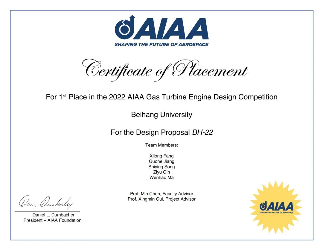 2018级本科生方玺龙、姜国河、宋世英、覃子宇、马文豪在指导教师陈敏教授、桂幸民教授的精心指导下,经过6个月的辛苦准备,在美国航空航天学会American Institute of Aeronautics and Astronautics(AIAA)国际本科生航空发动机设计大赛中获得冠军,这是自2017年以来,北航学子在此项赛事中第三次闯入决赛,第二次获得冠军。