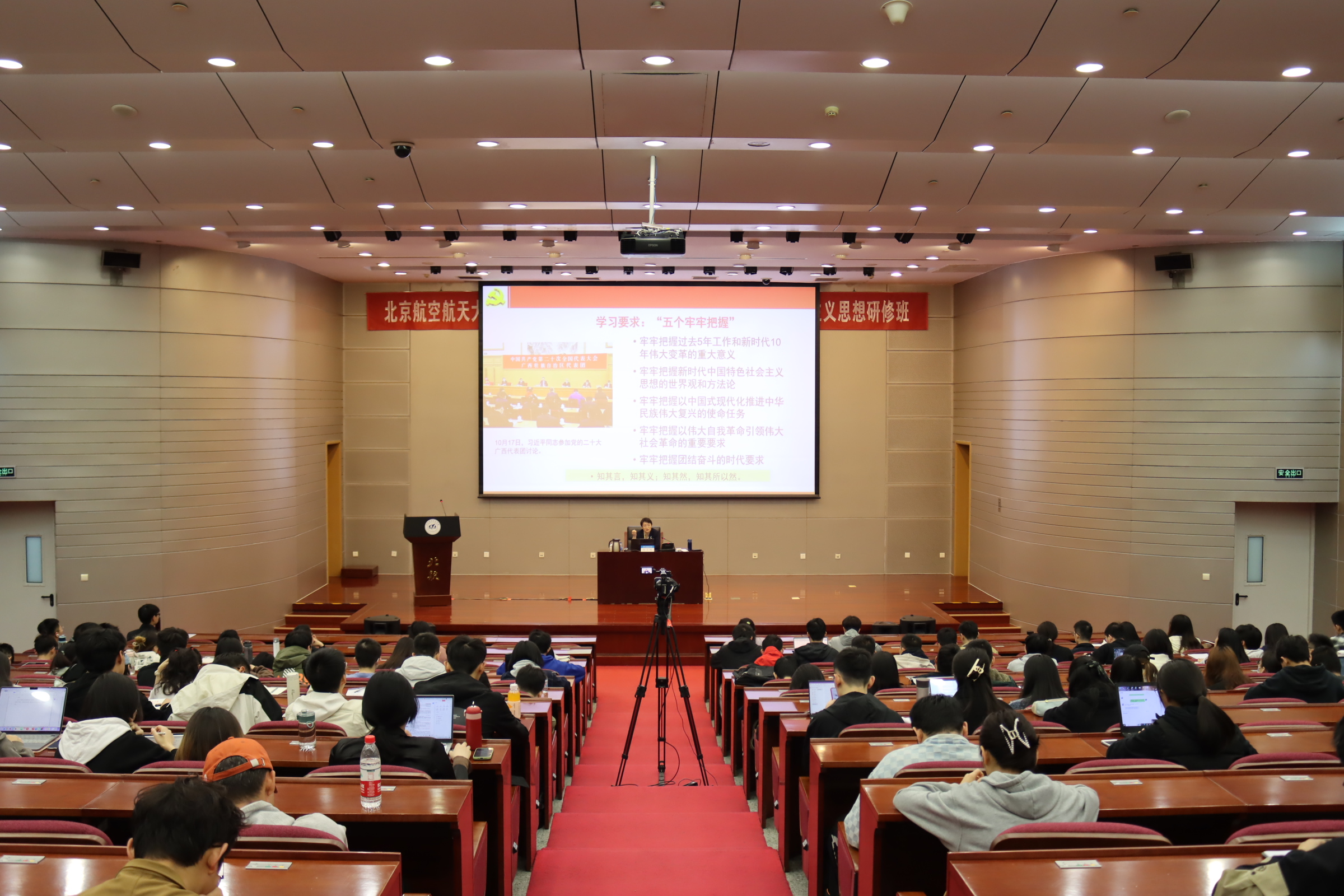 4月22日,研修班进行第一次理论学习,此次学习研修班邀请了中央党校(国家行政学院)哲学教研部党总支书记赵立地作《新时代新征程的政治宣言和行动纲领——学习党的二十大精神主题报告》。上午九时三十分,研修班理论学习在两个校区、三个会场同步开始,全校30个学院100余名专兼职辅导员、450余名新发展学生党员参加学习,国产成人在线
