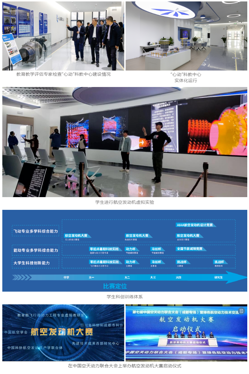 学院做实科教协同,总结三代人传承自强中国心精神、科教协同育人经验,建成首批科教协同创新平台——“心动”科教中心,聚焦专业教学实验、科技创新实践、先进设备共享、科普宣传教育四大功能,占地2400平米,设备600台套,承载12门课程、40项实验,建成17套虚拟/混合现实设备和VR资源编辑器、发动机原理演示、虚拟拆装等6套软件。引进航发国产设计软件,购置并共享使用重大科研仪器设备,建强中心师资队伍。学院梳理构建分层次全链条学生科创训练体系,发起航空发动机大赛,培育孵化重点科创项目,培养学生科技创新能力和多学科综合能力,增强学生创新意识和工程实践能力。