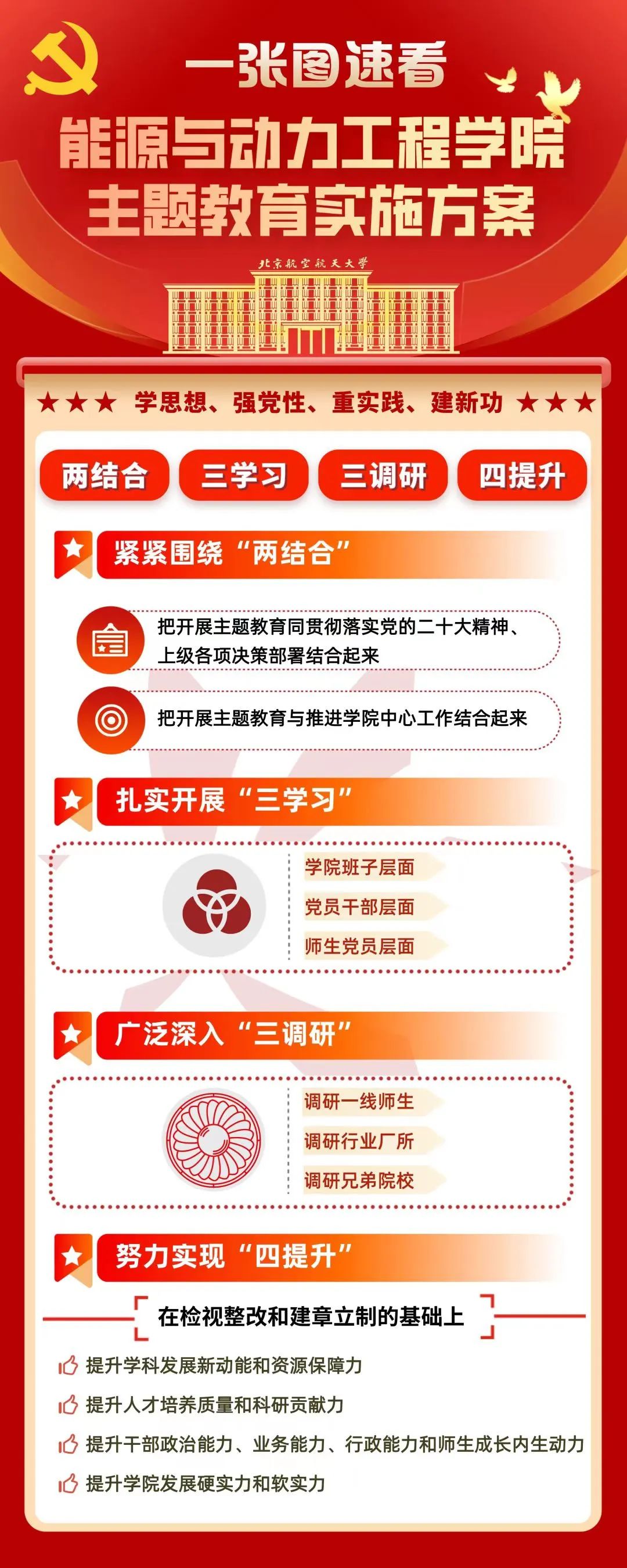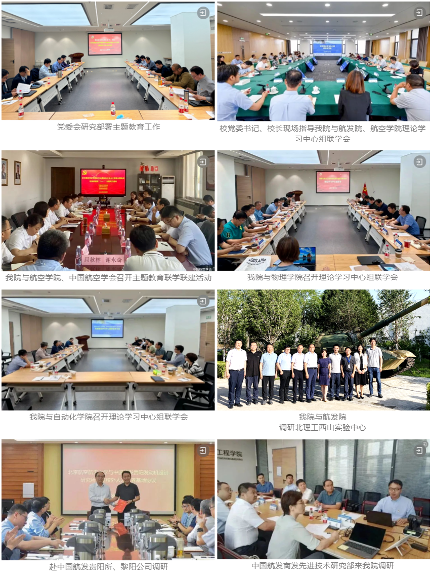 学院第一时间召开党委会研究制定实施方案,明确“两结合、三学习、三调研、四提升”的基本思路和重点任务。理论中心组学习20次,与中国航空学会、物理学院、自动化学院等5家兄弟单位开展联学,实质推动国际交流平台搭建、理工融合机制创新、交叉学科人才引进、加快条保建设等工作。全体支部书记联学备课、全覆盖宣讲,教师以支部系所、学生以支部班团为单位广泛开展学习活动。按照提前对接需求、制定合作备忘录、每月跟踪问效的调研模式,走访调研贵阳所、动研所、西航公司等7家厂所和北理工、哈工程、上交大等6所高校,形成7份调研成果报告,实施21项整改措施并推动全部按期销号,制定学科建设、校企合作等方面的8项新制度新机制,把主题教育成果转化为推动事业发展的能力和动力。