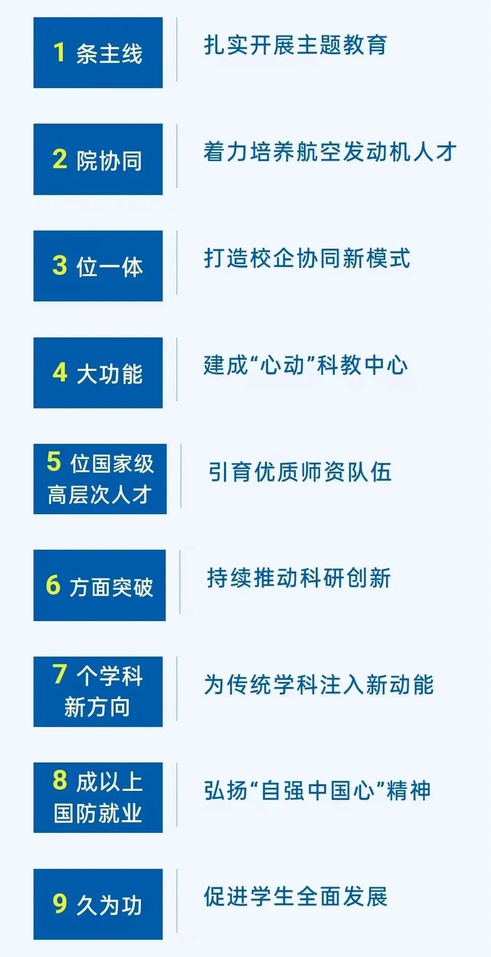 学院全过程全方位弘扬“自强中国心”精神,推进大中衔接贯通教育,选拔20位博导,率先启动“启航导师”计划,四川、辽宁高考招生实现进位。组织师生交流会31场510人次,完善“心动”奖学金体系,大类招生第一志愿满足率达143%。核心专业课均纳入课程思政体系,历时三年正式出版院史,原创话剧《自强中国心》首演,“能动大讲堂”举办25场讲座,“航空强国中国心”教育基金首次在全国性空天动力大会上颁奖。学生积极投身强国建设,今年81%的硕士毕业生、85%的博士毕业生到国防系统就业。