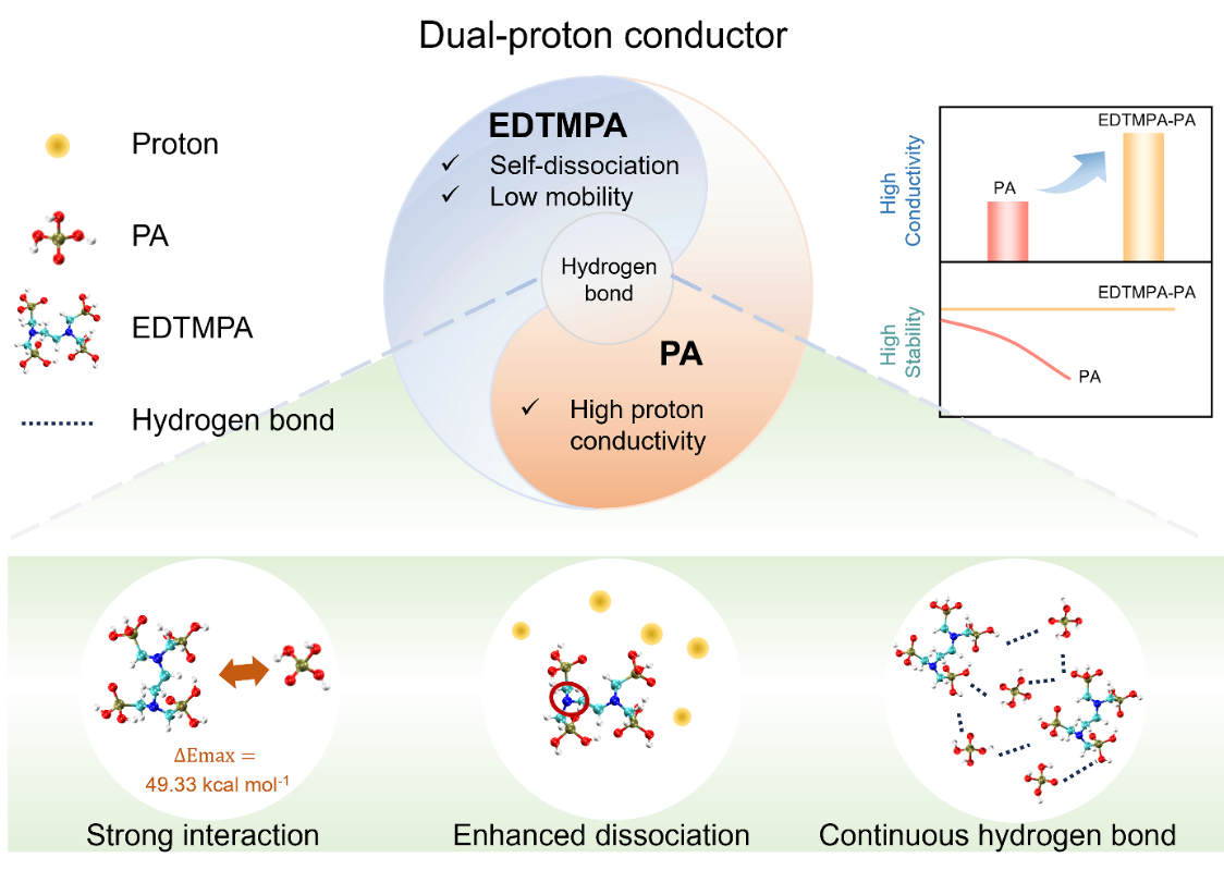 在本工作中选用乙二胺四亚甲基膦酸(EDTMPA)和磷酸(PA)组成双质子导体模型体系,重点探究了二者之间的协同作用。密度泛函理论(DFT)计算结果表明EDTMPA与PA之间存在强的氢键相互作用(49.33 kcal mol-1),能够有效锚定PA,减缓PA流失;另外通过吉布斯自由能计算和第一性原理分子动力学模拟(AIMD)发现EDTMPA结构上的碱性N原子可以被PA质子化,增强了质子解离;此外,PA的溶剂化效应和高温环境使EDTMPA具有更高的动态迁移和质子解离能力,有助于构建更连续的质子传输氢键网络,增加质子传输路径。