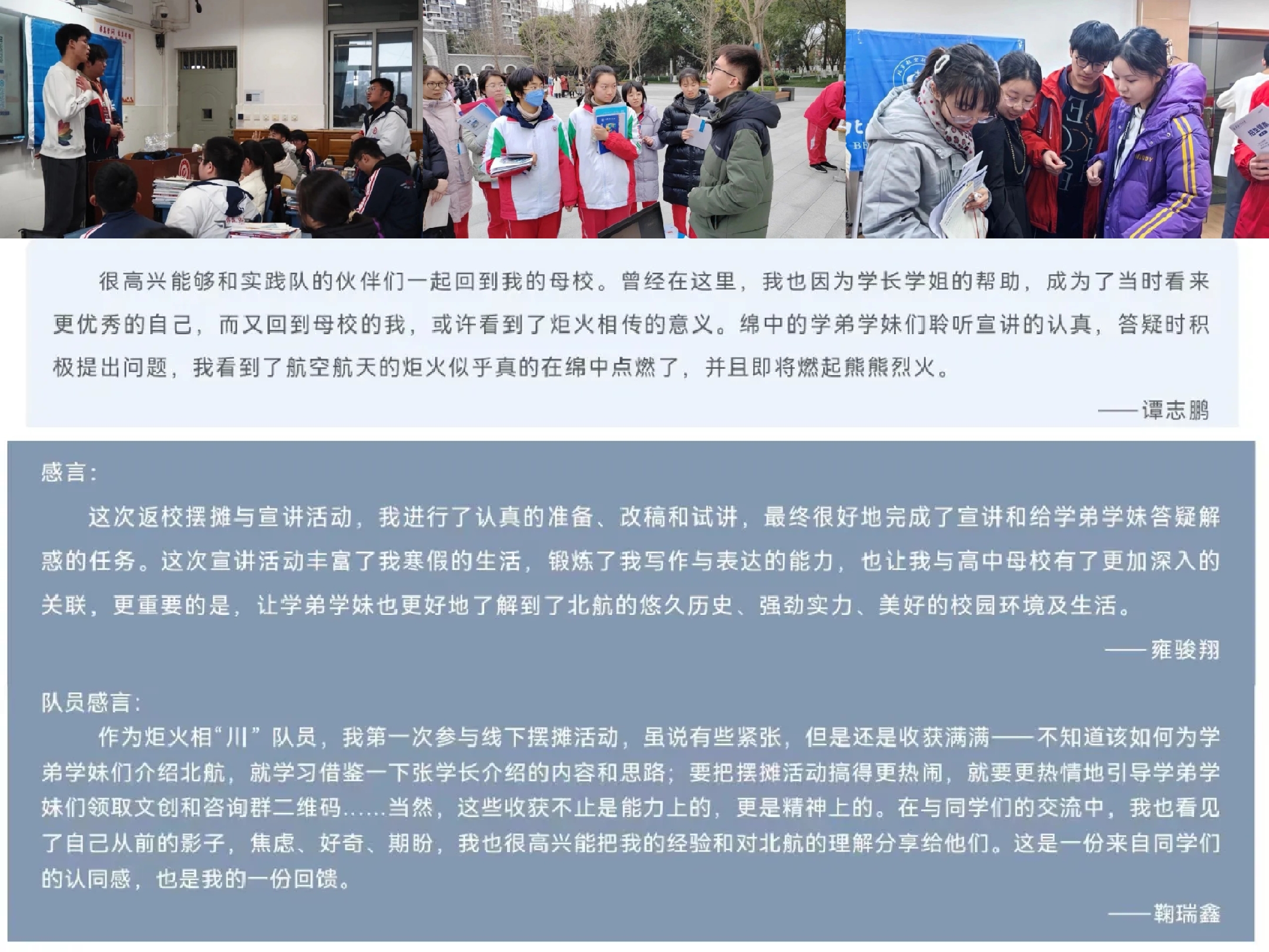 · 对于成都市树德协进中学的高三学生们,实践队侧重于分享高三心态调整经验,并带来了“四图识北航”宣讲。