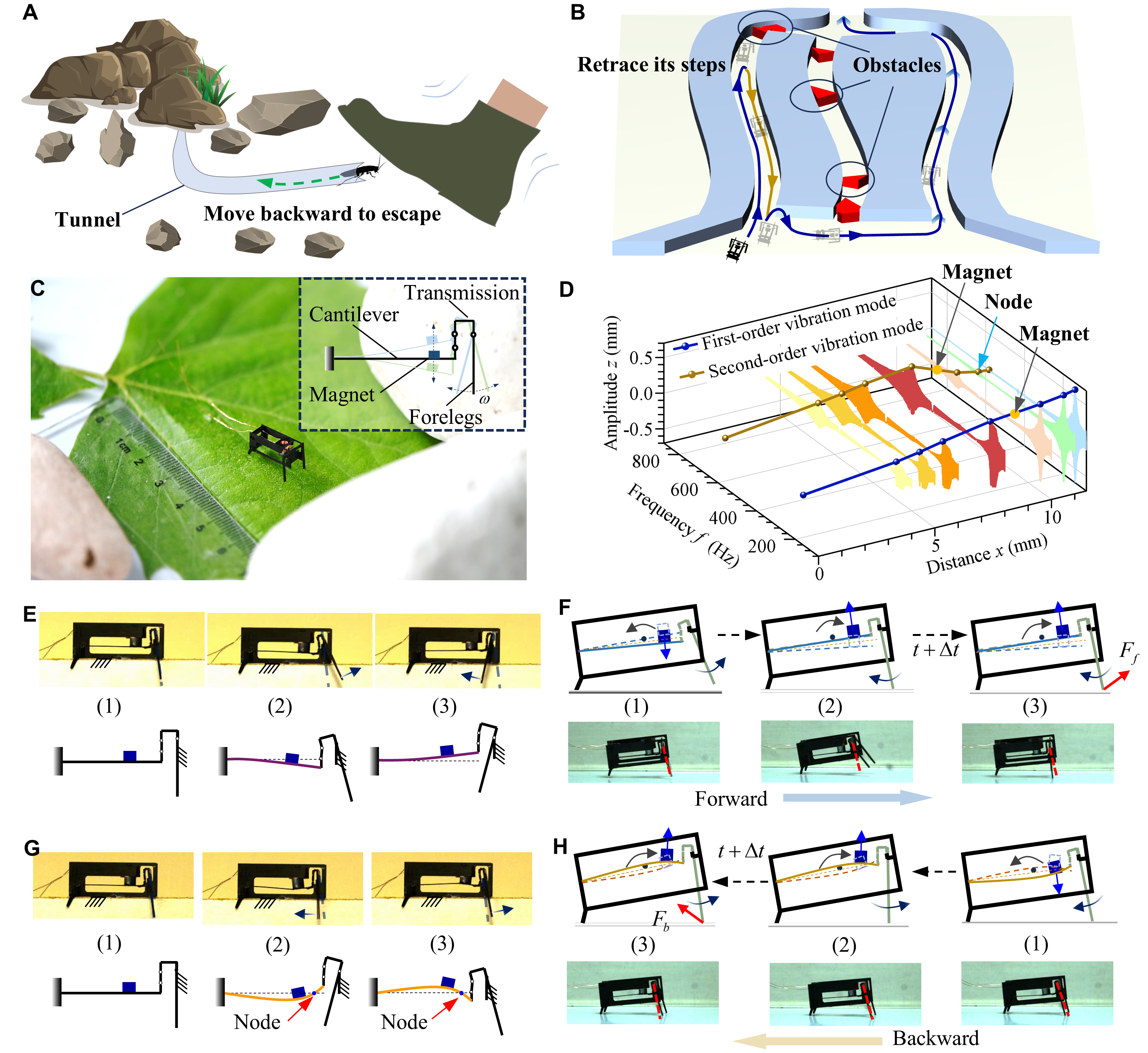 闫晓军教授和刘志伟副教授研究团队在微型动力领域再获重要进展。继今年5月8日北航机器昆虫研究成果登上Nature子刊后,近期北航机器昆虫又登上Science子刊。在北航机器昆虫BHMbot(BeiHang Microrobot)原型机的基础上,团队提出一种基于振动模态变换的机器昆虫“前跑”和“倒跑”控制方法,成功解决了微型机器昆虫进入狭窄封闭单向通道(宽度不足以实现转弯掉头)、原地无法快速后退的难题,实现了2cm微型机器昆虫的前进、后退双向快速运动、无线控制和传感器集成验证。2024年10月25日,相关研究成果以“Forward and Backward Control of An Ultrafast Millimeter-Scale Microrobot via Vibration Mode Transition”为题在线发表于《科学•进展》(Science Advances)杂志。
