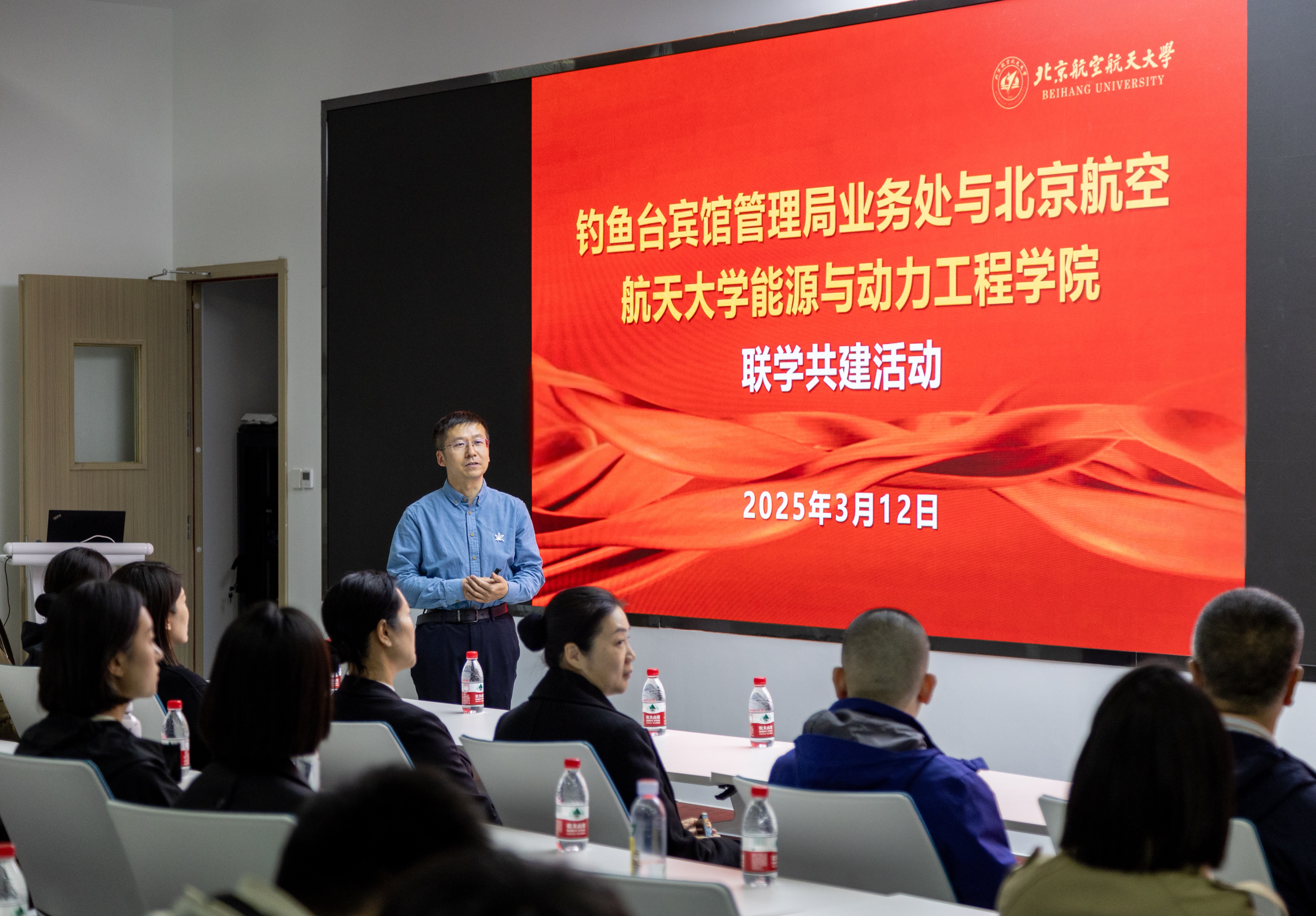党建引领聚合力,共建交流促提升。在交流会上,学院党委书记董卓宁对钓鱼台宾馆管理局业务处一行的到来表示热烈欢迎。双方分别就党建工作与业务工作开展情况进行了介绍,并表示通过此次共建交流活动,进一步加深了青年干部师生对航空航天精神和中国特色大国外交理念内涵的理解和认识,在加快建设教育强国、科技强国、人才强国,不断开创中国特色大国外交新局面征程上展现新担当实现新作为。