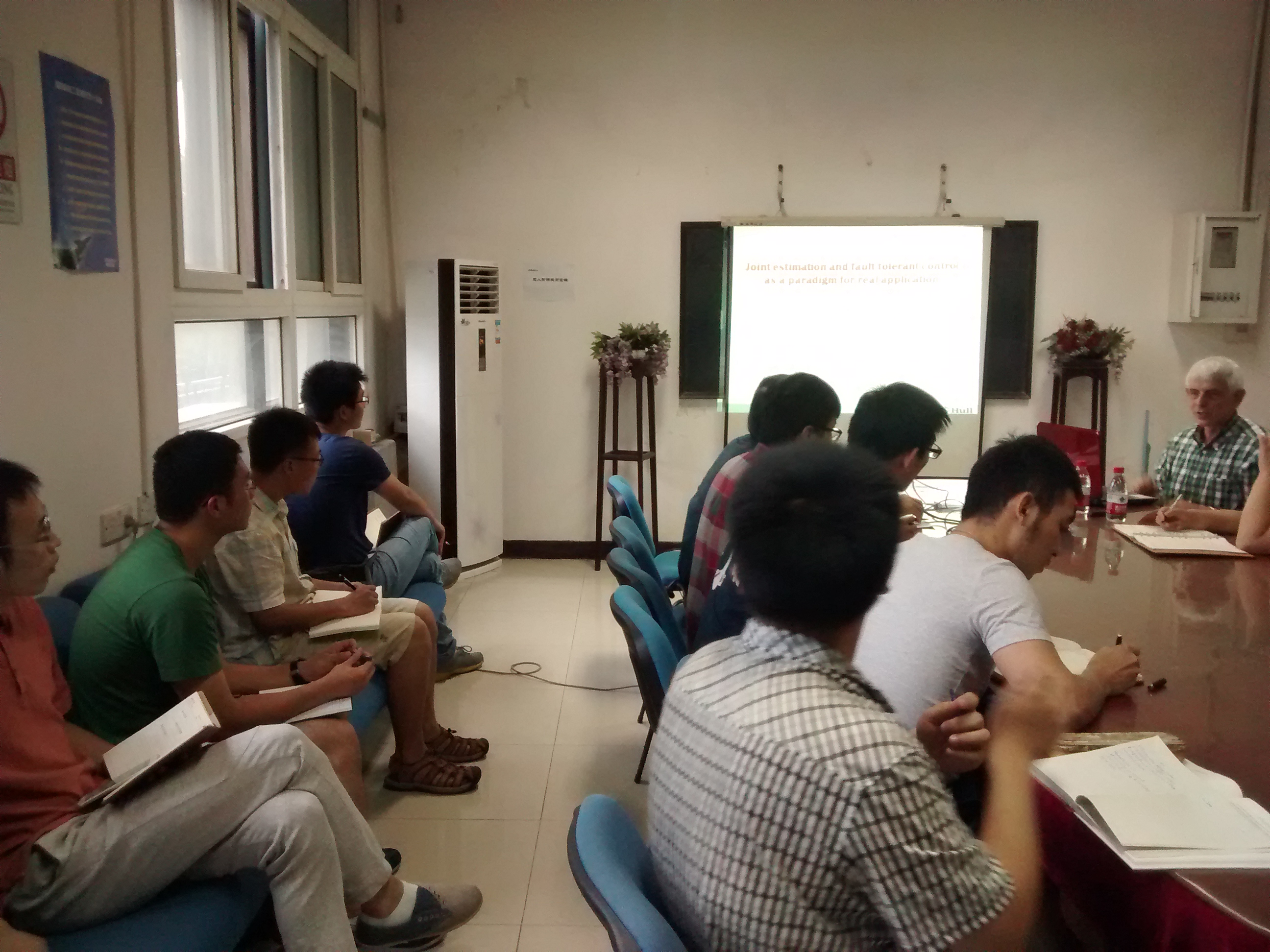 在当天的报告会上,Patton教授以《Joint estimation and fault tolerant control as a paradigm for real application》为题,作了近3个小时的学术报告,以故障诊断和容错控制的应用实例为切入点,为我校师生介绍了将优秀的容错控制性能和鲁棒设计相结合的设计过程,详细描述了故障诊断和容错控制的工程应用及未来的发展前景。报告内容深入浅出,在场师生认真聆听了学术报告,并积极地与Patton教授进行了关于各个专业领域里容错控制问题的学术讨论。其间,参会的研究生同学积极提问,Patton教授耐心回答同学们提出的各种问题,并语重心长的提醒现场的师生,不能纸上谈兵,要把学术问题放在实际应用中。在座师生被Patton教授幽默的谈吐风格、深厚的专业素养和广阔的专业视角所深深折服,并受益匪浅。